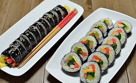Seaweed, rice,carrots, cucumber, pickled radish, egg, choise of sausage or rib-eye beef.------------------------$5.99 |